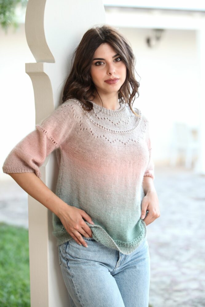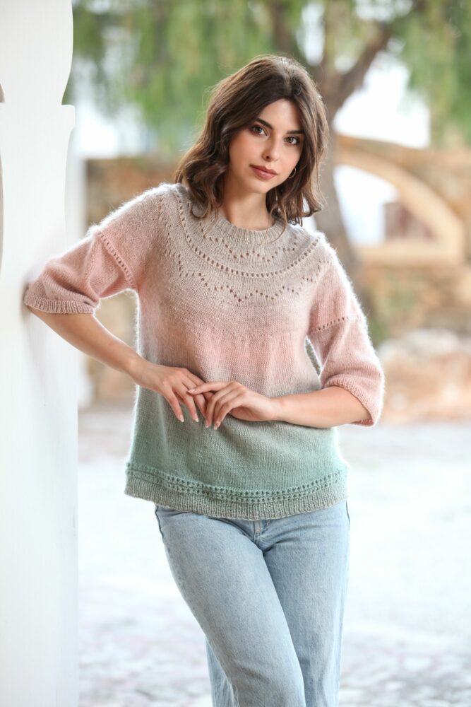 Un très joli pull tricoté en rond, de haut en bas, avec un empiècement circulaire.